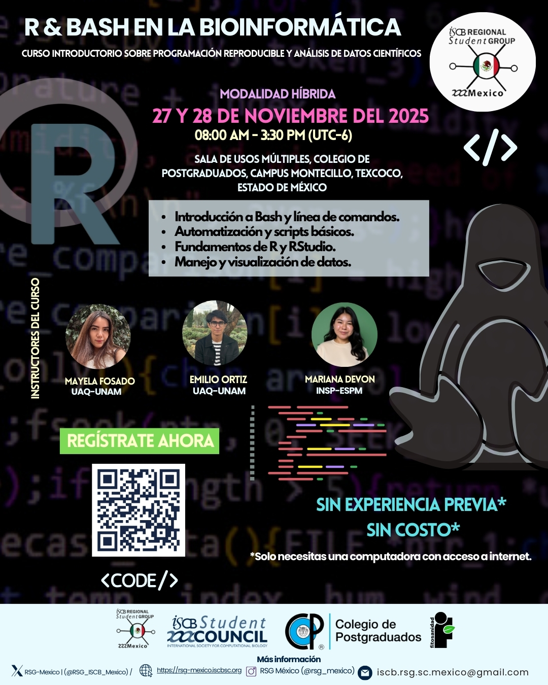 Este curso ofrece una introducción práctica al uso de herramientas computacionales esenciales en bioinformática. Las y los participantes aprenderán a interactuar con la computadora mediante la línea de comandos Bash para explorar, organizar y manipular archivos, así como a utilizar R a través de la interfaz de RStudio para realizar análisis básicos, generar gráficas simples y estructurar proyectos reproducibles.